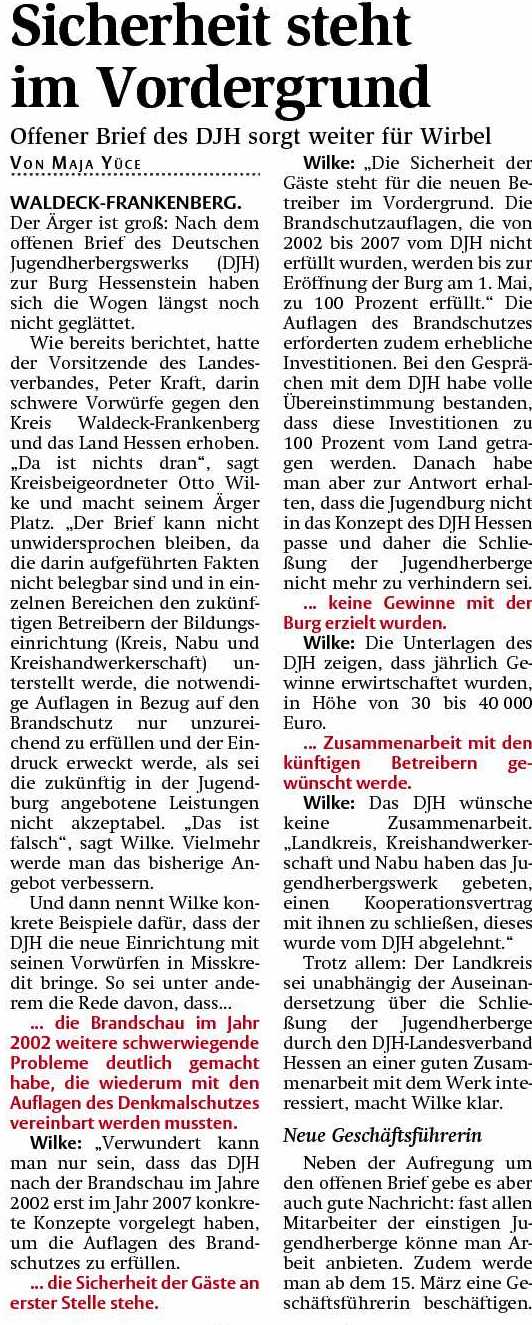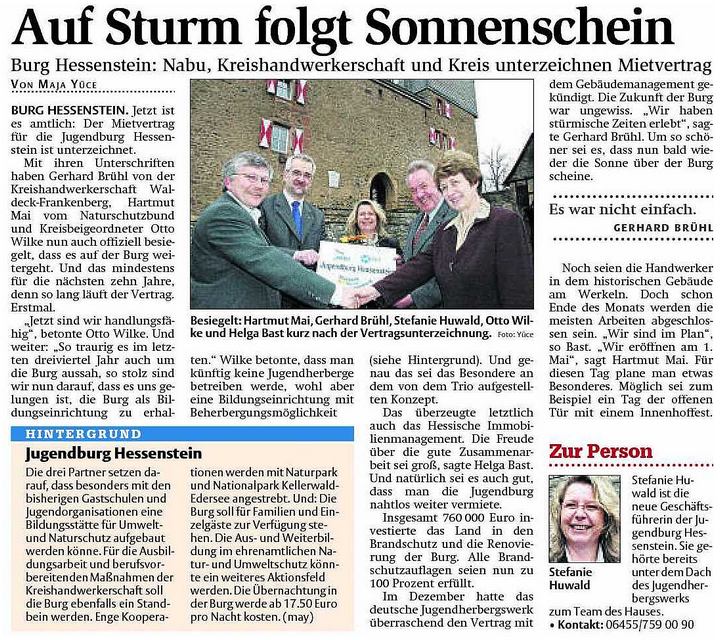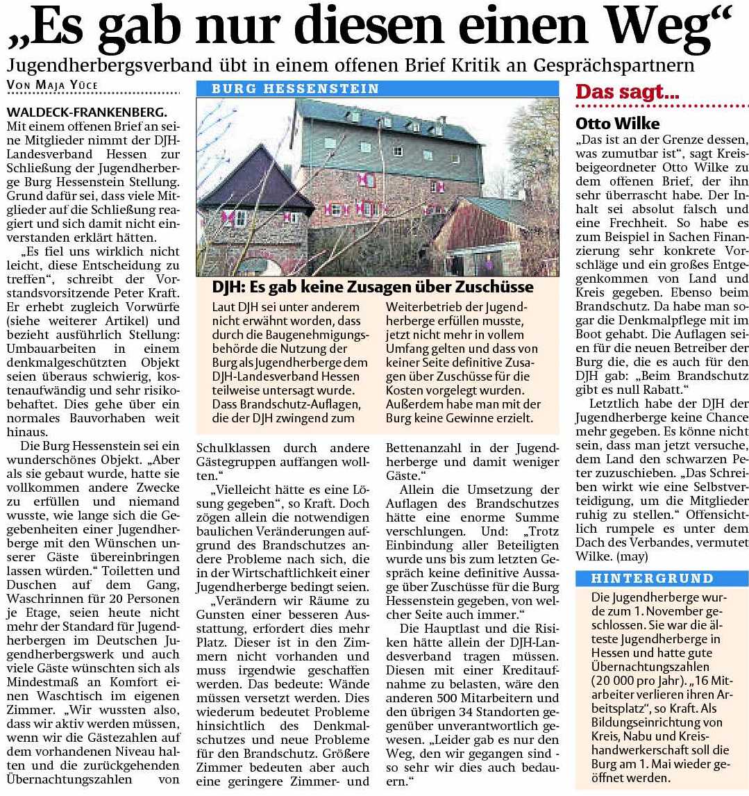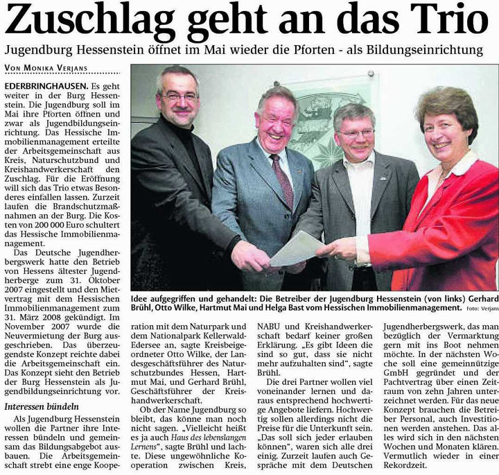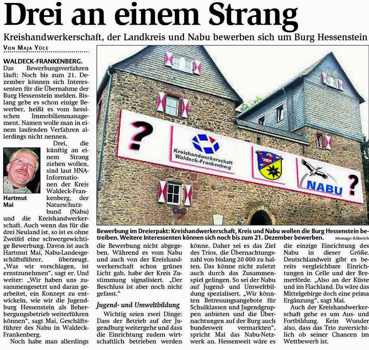 VÖHL - EDERBRINGHAUSEN. Seit vergangener Woche steht die Burg Hessenstein offiziell zur Vermietung. Jetzt signalisiert der Naturschutzbund (NABU) gemeinsam mit dem Landkreis und anderen, noch ungenannten Verbänden sein Interesse an der Jugendherberge. Gemeinsam wollen sie die Herberge als Bildungseinrichtung im April wieder öffnen, im besten Fall mit dem DJH als Vermarktungspartner.