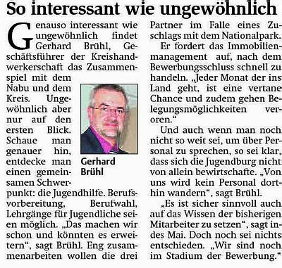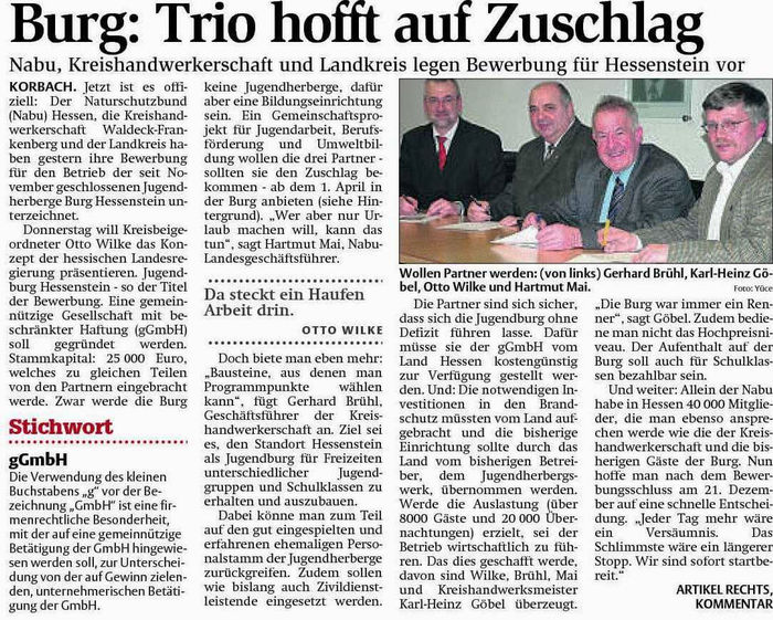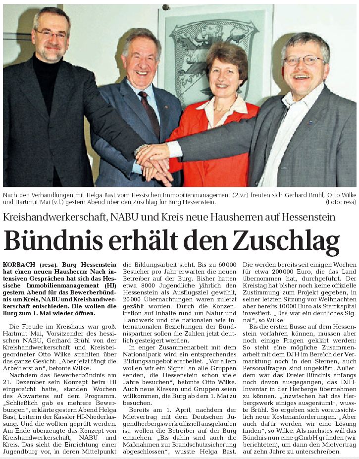„Die Burg liegt uns am Herzen“, betonte auch Mai. Deshalb sei der NABU sehr bestrebt, an einer Lösung mitzuarbeiten, damit der Herbergsbetrieb wieder aufgenommen werden könne. Noch müsse allerdings das wirtschaftliche Risiko geprüft werden. „Wir sind schließlich ein Umweltverband und kein Wirtschaftsbetrieb“, erklärte Mai. Die Eckpfeiler des neuen Konzepts würden aber stimmen. Heute Nachmittag wollen sich nun Vertreter des NABU, des Kreises, einer weiteren Institution und des Hessischen Immobilienmanagements im Kreishaus zusammensetzen. Dann sollen die letzten Fragen geklärt werden, bevor das gemeinsame Konzept vorgelegt wird. „Wir wünschen uns, noch vor Weihnachten fertig zu werden“, sagte Mai. Die HI-Ausschreibung ist bis zum 21. Dezember befristet. „Es haben sich verschiedene Interessenten gemeldet“, erklärte gestern auch Christiane Bockler-Wendtland vom HI.