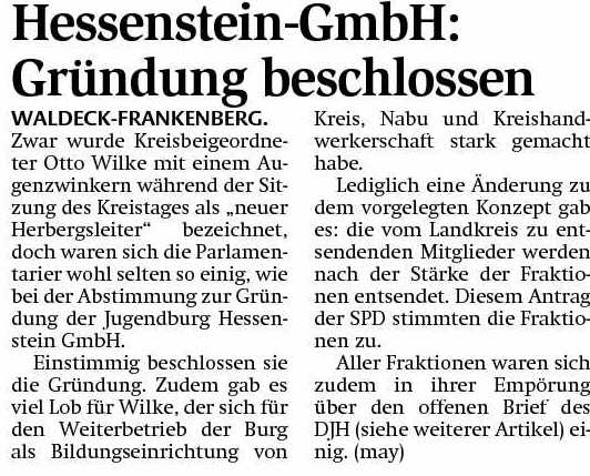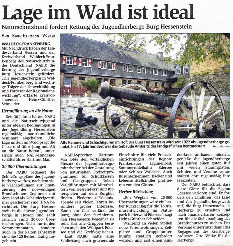 Vertreter sehen Nachteile für TourismusentwicklungWALDECK - FRANKENBERG (sr). Der Naturschutzverband NABU fordertdie Rettung der Jugendherberge Burg Hessenstein. „Die Jugendherbergen in Waldeck-Frankenberg sind wichtige Träger der Umweltbildung und Förderer der Regionalentwicklung“, be-tont Kreisvorsitzender Heinz-Günther Schneider.