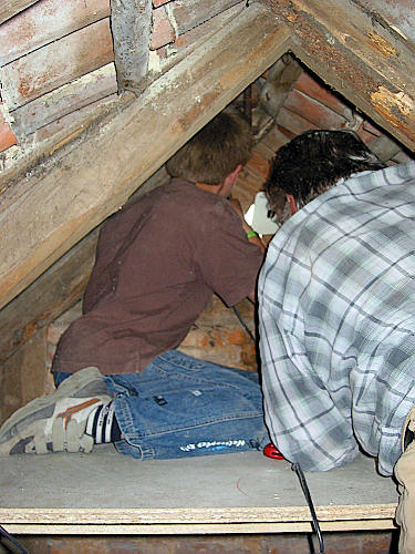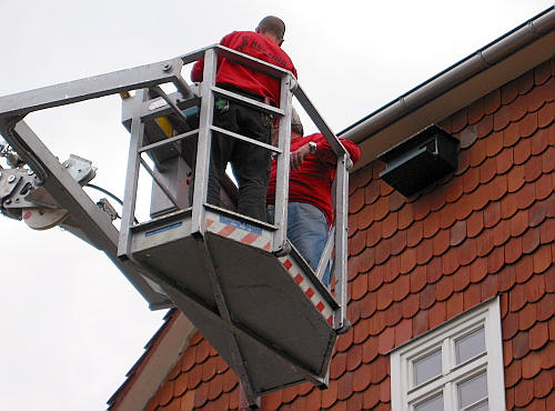 Arbeiten am Einflugloch des Schleiereulenkastens