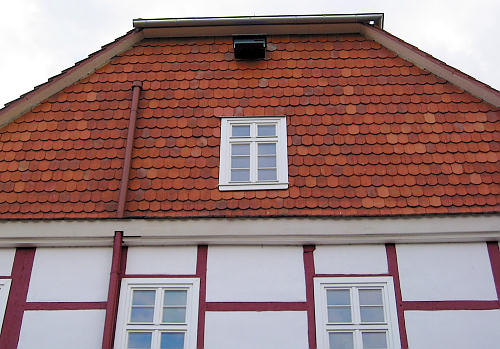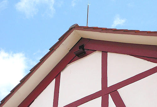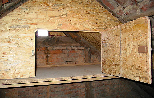 Der Schleiereulenkasten ist sehr groß ausgeführt, damit die Jungvögel genug Platz für das Training ihrer Flugmuskulatur haben. Die Tür dient zur Kontrolle des Kastens vom Dachboden aus. Im Hintergrund sieht man das Einflugloch. |