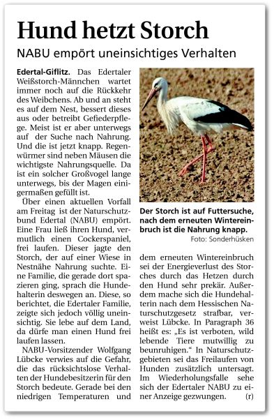 Hund hetzt Storch - NABU empört über uneinsichtiges Verhalten