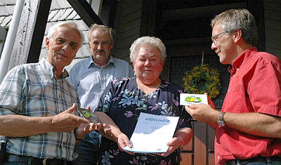 EDERTAL - BRINGHAUSEN (sr). NABU-Präsident Olaf Tschimpke und Umweltminister Wilhelm Dietzel zeichneten vor wenigen Tagen das zweite fledermausfreundliche Haus in Waldeck-Frankenberg aus. Rosemarie Finke ist stolz auf die kleinen Untermieter hinter der Schieferfassade ihres Fachwerkhauses.