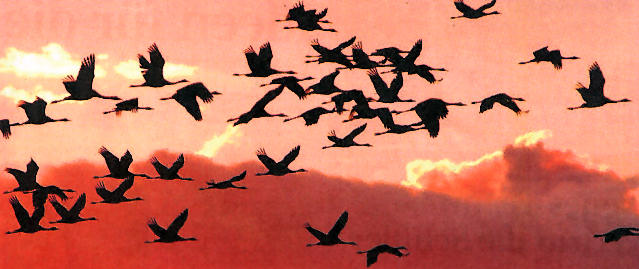 Im Flug bilden die Kraniche eine V-förmige Formation mit kräftigen, erfahrenen Tieren an der Spitze (Foto: bc). Es folgen Familien mit durchschnittlich zwei Jungtieren. Bei konstanten Flugbedingungen können die Tiere ohne Halt bis nach Spanien und Portugal fliegen.