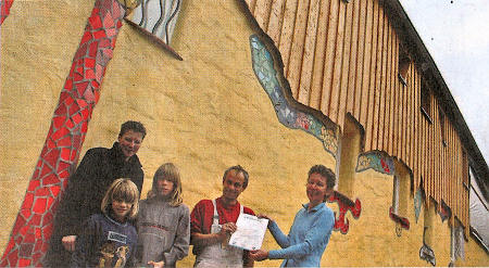 und die beiden Söhne Anton und Carl Miro. (Foto: sr)Die Vorsitzende der NABU-Ortsgruppe Höringhausen, Karin McKie, überreichte vor wenigen Tagen die Plakette „Fledermausfreundliches Haus" an die Familie. Die Auszeichnung wird vom Land Hessen und vom NABU an Hauseigentümer vergeben, die vorhandene Fledermausquartiere am Haus erhalten oder neue Verstecke schaffen.