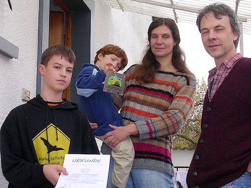 Familie Linde erhielt eine Urkunde und die Plakette "Fledermausfreundliches Haus. Foto: Seumer Erst seit wenigen Monaten wohnt die Familie Linde in Frankenberg in ihrem neuen Eigenheim im Hassencampweg, und schon mit vielen Zwergfledermäusen unter einem Dach. Im Juni entdeckten Stefan, Cedric und Elke Linde drei junge Zwergfledermäuse auf dem Dachboden, die aus dem Spaltenquartier unter dem First gefallen waren. Sie brachten die Fledermäuse zu einem Tierarzt, der den NABU um Rat und Hilfe bat. Die Jungtiere wurden wieder ins Quartier eingesetzt und sicher wieder von ihren Müttern angenommen.