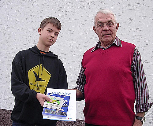 Bis zu 70 Tiere zählte die Frankenberger Naturschutzjugend. Manuel Geitz überreichte seinem Nachbar die Plakette, Urkunde und das Buchgeschenk zur Auszeichnung Fledermausfreundliches Haus.