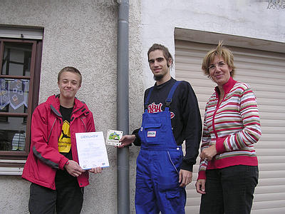 Die Plakette überreichte Lars Jerrentrup von der NABU/Naturschutzjugend Frankenberg an David Wenzel und Mutter Sonja Ludwig-Wenzel.