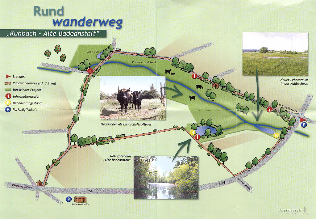 Der Rundwanderweg "Kuhbach - Alte Badeanstalt" direkt an der B 251 zwischen Korbach und Lelbach führt sie direkt am mehr als 13 ha großen Heckrindergatter vorbei und leitet sie auch zu anderen Besonderheiten, wie dem Naturdenkmal "Alte Badeanstalt", dem Feuchtgebiet "Öhls Teich" und dem im Jahr 2001 auf einer Länge von rund 700 Metern renaturierten Kuhbach. Als größtes zusammenhängendes Feuchtgrünlandgebiet im Raum Korbach stellt das Areal schon seit jeher einen interessanten Brut- und Rastplatz für die heimische Vogelwelt dar.