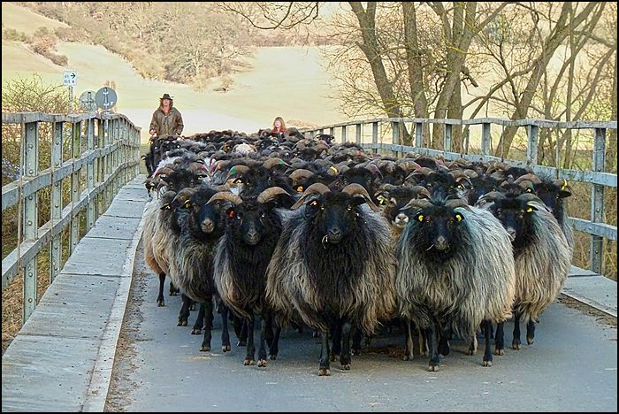 ▲ Die Heidschnucken beim Überqueren der Ederbrücke bei Anraff ▲