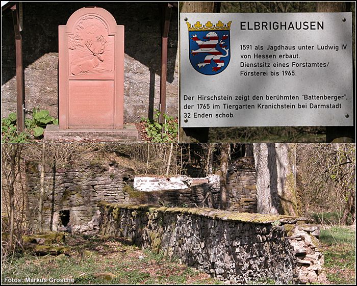 oben: Hirschstein und Hinweistafel unten: Ruinen des ehemaligen Forsthauses Elbrighausen