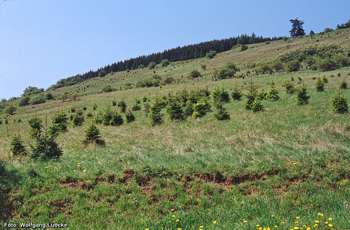 Im Rahmen der Pflegemaßnahmen sind zum Teil Fichten zurückgenommen worden und es findet eine extensive Beweidung mit Heidschnucken statt.