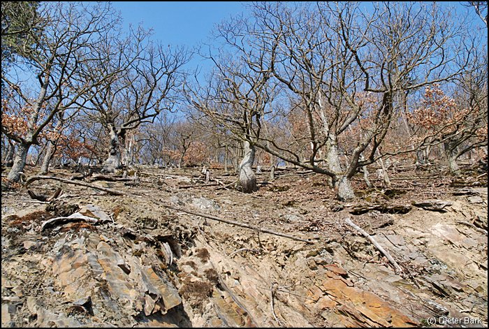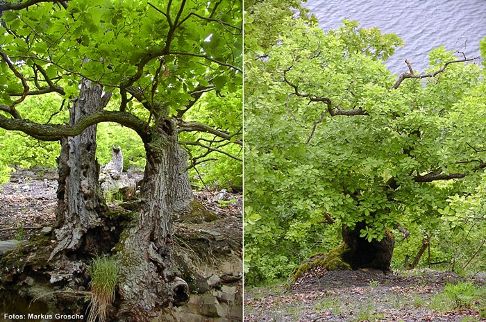 Die uralten Trauben-Eichen haben sich bei den extremen Lebensbedingungen nur sehr langsam entwickeln können und erreichen selten eine Höhe von mehr als fünf Metern. Die Flachgründigkeit des Bodens und die Wurzelkonkurrenz bedingen relativ große Abstände zu den Nachbarn. Durch Erosion wurde die oberste Wurzelschicht oft freigelegt, vielfach bilden mächtige Wurzelknollen den Stammfußbereich. Stirbt ein Altbaum, treiben aus dem Stammfuß oft junge Triebe, die zu einer neuen Baumgeneration heranwachsen und somit ein ewiges Werden und Vergehen symbolisieren. Regelmäßig finden sich Dürreschäden und natürliche Alterung von Strukturen. So besitzt jeder Baum eine individuelle Gestalt mit oft bizarren Formen.
