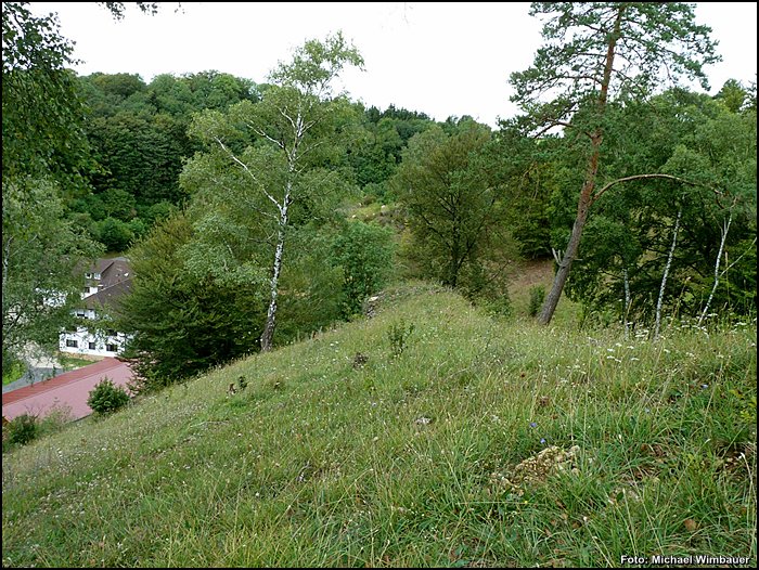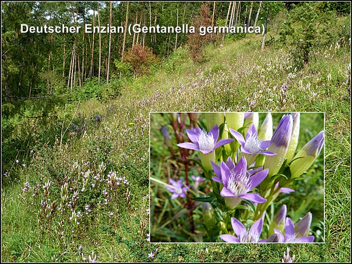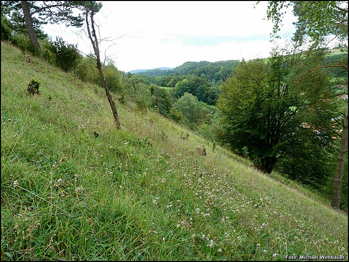 Wo die Hänge feinerdereicher und tiefgründiger werden, so etwa an Unterhängen, in Mulden oder Plateaulage, gehen die Blaugrasrasen in klassische Kalkhalbtrockenrasen vom Typ Enzian-Fiederzwenken-Rasen mit der charakteristischen, im Kapitel Magerrasen (s. S. 3l) beschriebenen Artengarnitur über. Insgesamt neun Orchideenarten wachsen in den Magerrasen und lichten Wäldern des Naturschutzgebietes. Die Halbtrockenrasenfläche nördlich des Wehrsteins hat die beste Artenausstattung: Hier befinden sich Dreizähniges und Stattliches Knabenkraut (Orchis tridentata, 0. mascula) sowie in großer Individuenzahl Fliegen-Ragwurz (Ophrys insectifera). Als regionale Rarität wächst hier das Große Windröschen (Anemone sylvestris) an seinem letzten erhaltenen Fundort in Waldeck-Frankenberg.